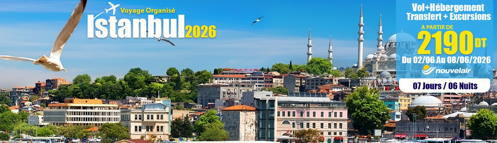 Prestations incluses Billet d’avion Tunis – Istanbul – Tunis Vols opérés par la compagnie aérienne Nouvelair. Transferts Transferts assurés en véhicule touristique climatisé : Aéroport – Hôtel – Aéroport. Hébergement 7 nuitées en logement avec petit-dé
