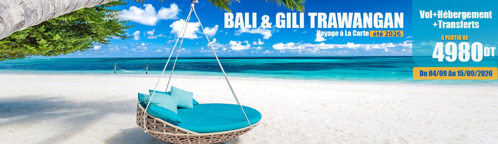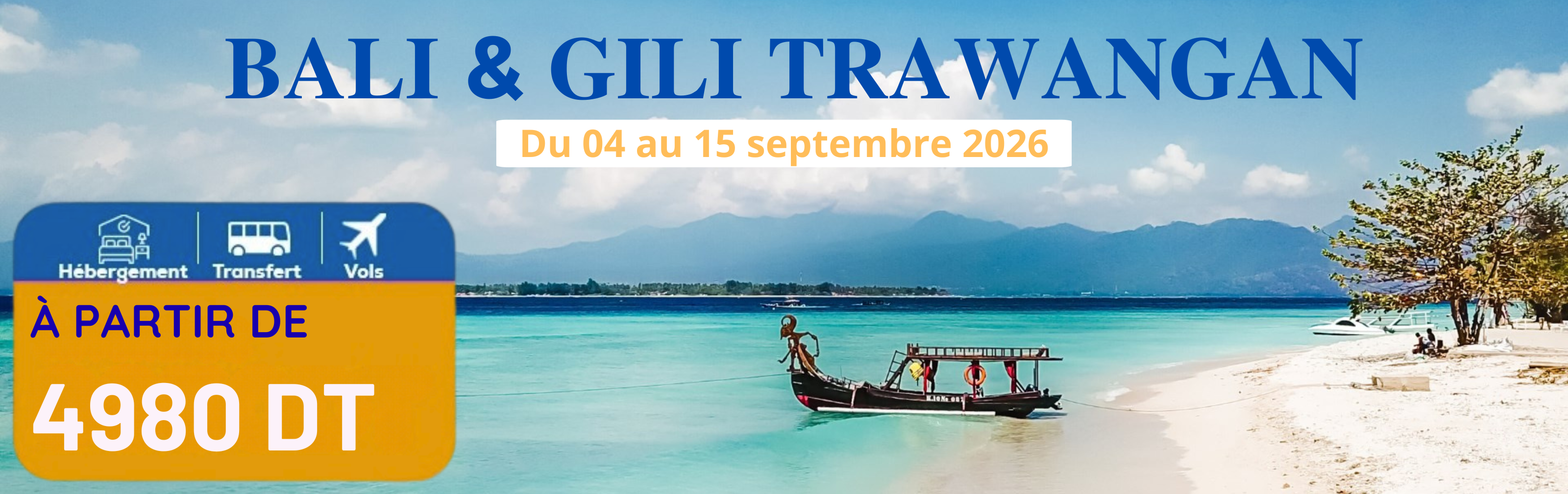 Circuit 11 jours / 9 nuits à Bali : 4N Seminyak, 2N Gili Trawangan, 3N Ubud avec vols Turkish Airlines, excursions Uluwatu, Nusa Penida, Ubud–Kintamani, rafting et transferts inclus.